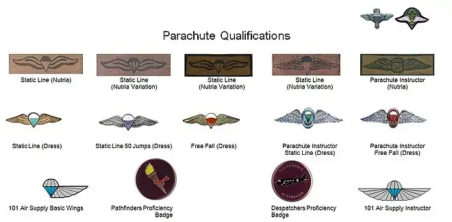 - Treinamento paraquedista especializado e outros cursos de treinamento incluem: