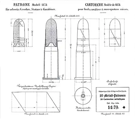 Em sua versão original, o 10.4x38mm R Suíço com um estojo metálico feito de "tombac" (94% cobre, 6% zinco) em forma de "garrafa", usava uma carga de pólvora negra com balas de chumbo. Exceto pela carga um pouco mais pesada, eles equivaliam aos cartuchos do Milbank-Amsler e Peabody de tiro único. Cartuchos utilizando bagos do tipo "shotshell" eram ocasionalmente entregues e também havia uma bala incendiária com a designação de "GP 1867". Cartuchos de manipulação, que podem ser reconhecidos pelo estojo furado, foram entregues às tropas para exercício.