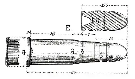 O estojo original era feito de uma liga de cobre-zinco que continha uma bala de chumbo de ponta redonda. Em 1871 e 1878, a bucha de papel que crimpava o conjunto foi melhorado, mas o desempenho balístico foi apenas marginalmente melhorado.[2]
