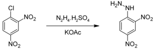 A 2,4-dinitrofenil-hidrazina está disponível comercialmente geralmente como um pó úmido. Pode ser preparado pela reação de sulfato de hidrazina com 2,4-dinitroclorobenzeno[2]: