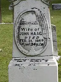 Lápide no cemitério do templo da antiga missão em Upper Sandusky, Ohio, mostra a data da morte de Christiana Haag: 31 de fevereiro de 1869.