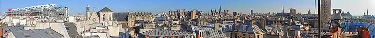 Vista de um telhado sobre muitos monumentos do arrondissement: Centro G. Pompidou, igreja de Saint-Merri, Hôtel-de-Ville, Notre-Dame, tour Saint-Jacques, théâtre de la Ville