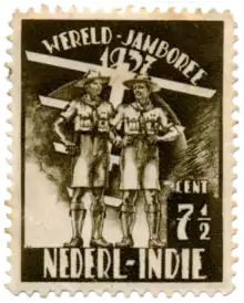 - «Een der' speciale Jamboree-zegels, welke met toeslag van 1 Mei t/m 9 Juni a.s. verkrijgbaar worden gesteld ten behoeve van de vereeniging De Ned-Indische Padvinders. De netto-opbrengst van den toeslag wordt benut tot financiering van de uitzending van Ned.. Indische padvinders naar de Wereldjamboree.». Nieuwe Tilburgsche Courant (em neerlandês). 8 de abril de 1937. Consultado em 29 de agosto de 2010