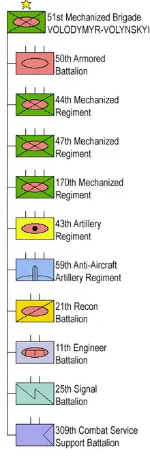 A 51.ª Brigada Mecanizada da Guarda era uma unidade das Forças Terrestres Ucranianas, estacionadas em Volodimir no oblast da Volínia, na fronteira com a Polônia. A Brigada desenhou sua história a partir da 51.ª Divisão de Rifles da Guarda, que foi formada a partir da 76.ª Divisão de Rifles no meio da Segunda Guerra Mundial. No final de 1942, a 76.ª Divisão de Rifles dizimou a força alemã que mantinha e protegia Kletskaya, uma importante cidade industrial com inúmeras indústrias metalúrgicas. Para isso, a divisão passou a fazer parte da Guarda (Советская Гвардия) em 23 de novembro de 1942, e ficou conhecida como a 51.ª Divisão de Rifles da Guarda.