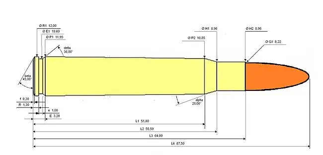 Como é habitual nos cartuchos europeus, o 8 denota o calibre da bala de 8 mm e o 64 denota o comprimento do estojo de 64 mm (2,52 pol.).