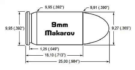 Os calibres na URSS eram medidos entre os "cheios" do estriamento e não entre os "fundos". Como tal, a munição 9×18mm Makarov usa uma bala de diâmetro maior do que outros cartuchos de 9 mm comuns, medindo 9,27 mm (0,365 pol.), Em comparação com 9,017 mm (0,355 pol.) do 9×19mm Parabellum. Após sua introdução em 1951, a munição 9×18mm Makarov se espalhou pelas forças armadas das nações do bloco oriental.