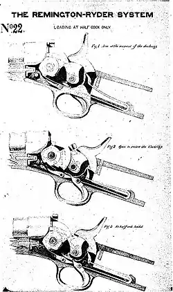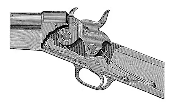 O mecanismo dessa ação pivotante funcionava assim: a alavanca que comandava a ação era liberada através de uma alavanca menor dentro dela; abaixando a alavanca de operação (que também servia como guarda-mato), um bloco retangular pivotante era erguido; esse bloco continha uma cavidade cônica na qual o cartucho metálico exclusivo, também cônico era inserido com a bala para cima; ao fechar a alavanca de operação, o bloco gira para a frente inserindo o cartucho na câmara. A ignição era feita por espoleta de percussão posicionada sobre um pequeno orifício na base do cartucho efetuando a ignição do propelente, porém permitindo algum vazamento de gás na parte traseira do cartucho.[2]