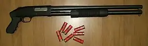 Exemplar de uma escopeta Mossberg 500 que atua por ação de bombeamento.