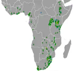 Pode ser encontrada nos seguintes países: Angola, Benin, Botswana, Burundi, Camarões, República Centro-Africana, República do Congo, República Democrática do Congo, Costa do Marfim, Guiné Equatorial, Etiópia, Gabão, Gambia, Gana, Guiné, Guiné-Bissau, Quénia, Lesoto, Libéria, Malawi, Mali, Moçambique, Namíbia, Níger, Nigéria, Ruanda, Senegal, Serra Leoa, Somália, África do Sul, Sudão, Essuatíni, Tanzânia, Togo, Uganda, Zâmbia e Zimbabwe.