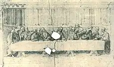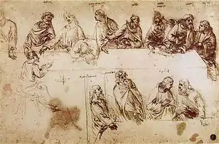 Nos desenhos preparatórios Leonardo copiou inclusive a posição de um dos apóstolos debruçado sobre a mesa, possivelmente triste ou abatido ou, na descrição da cena nos Evangelhos, recostado sobre o colo ou ombro de Cristo que segundo exegetas seria João e que foi também o primeiro a saber da futura traição de Judas.