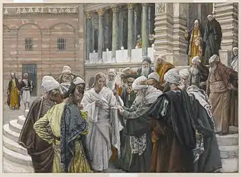 - a pergunta foi uma armadilha em forma de dilema para desacreditar Jesus como um colaboracionista ou denunciá-lo como um revoltoso,[21] na qual os discípulos dos fariseus perguntaram fingindo curiosidade inocente e fazendo um elogio hipócrita;