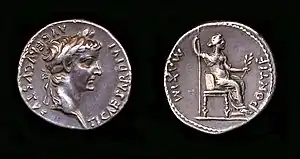 O texto identifica a moeda como um denário (em grego: δηνάριον - dēnarion)[4] e geralmente se acredita que seria portanto um denário romano com a éfigie de Tibério, que passou a ser conhecida como "moeda do tributo" e se tornou, por conta da história do evangelho, um cobiçado item para colecionadores.[5] A inscrição é Ti[berivs] Caesar Divi Avg[vsti] F[ilivs] Avgvstvs ("César Augusto Tibério, filho do Divino Augusto"). O reverso mostra uma figura feminina, geralmente identificada como sendo Lívia, representada como sendo a Pax.[6]