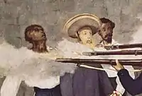 Maximiliano é executado na companhia de dois fiéis: o general Tomás Mejía (representado com uma pele acastanhada) e o ex-presidente e general de infantaria Miguel Miramón.