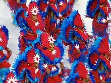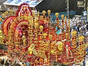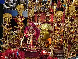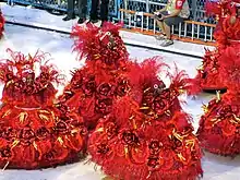 ![]() As 160 baianas da Beija-Flor desfilaram fantasiadas de rosas vermelhas, lembrando o costume do cantor Roberto Carlos em distribuir rosas para o público presente em seus shows. |