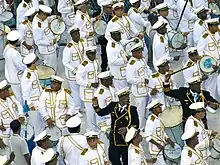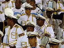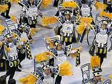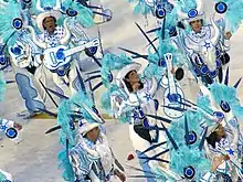 Ala 19 (Bateria): "O Comandante do Seu Coração" Os 253 ritmistas da bateria desfilaram vestidos de comandantes náuticos/marinheiros em referência ao projeto "Emoções em Alto Mar", show de Roberto Carlos que é realizado em um navio de cruzeiro. ![]() Os ritmistas da bateria. ![]() A rainha de bateria, Raíssa Oliveira. |