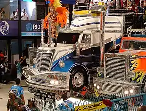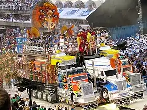 ![]() ![]() A quinta alegoria, assim como as alas que a antecedem, faz referência às canções de Roberto Carlos que exaltam os motoristas e a vida nas estradas, além do gênero sertanejo. O carro alegórico é decorado com grandes esculturas de carretas, caminhões e táxis, além de itens de sinalização como placas, cones e semáforos. Na alegoria, desfilaram ícones do sertanejo como Chitãozinho, Xororó, Roberta Miranda, Paula Fernandes, Bruno, Marrone, Gian e Giovani. | |