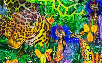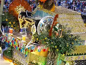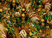 ![]() A ala trinta faz referência à canção "Coração Sertanejo" composta por Neuma Moraes e Neon Moraes, e gravada por Roberto Carlos em 2005. A fantasia é decorada com cabeça e chifre de gado e componentes carregam uma viola carnavalizada em alusão à letra da música, que diz que o sertão é um lugar onde não faltam estórias sobre animais e rios, e onde um violeiro toca para as pessoas sonharem. |