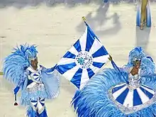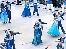 ![]() Assim como o primeiro casal, a primeira ala do desfile também faz menção às cores da escola, com os integrantes vestindo figurinos azul e branco. A ala é coreografada. Enfileirados, homens e mulheres formam pares. Segundo o roteiro oficial do desfile, "o pavilhão da agremiação ganha vida, transformando o chão da Avenida Marquês de Sapucaí em um dançante tapete azul e branco. É a Beija-Flor de Nilópolis vibrando com as emoções do Rei Roberto Carlos". | |