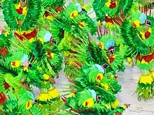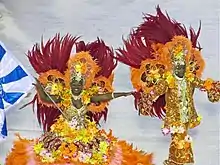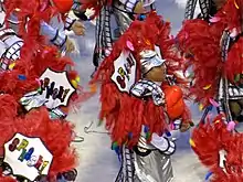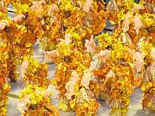 ![]() O segundo casal da Beija-Flor simboliza o flamboyant que tinha no quintal da casa em que Roberto morou em Cachoeiro quando criança. O flamboyant é uma árvore com flores em tons de vermelho, laranja e amarelo |