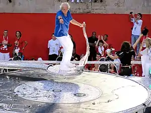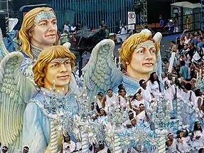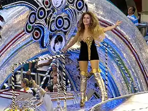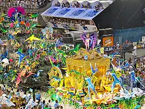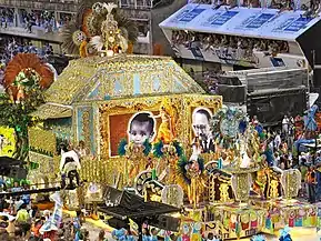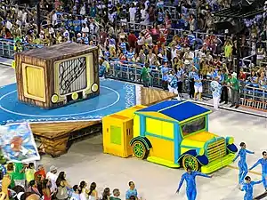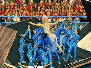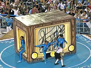 | Comissão de Frente: "Sonho... A Minha Inspiração" Coreografada por Carlinhos de Jesus, a comissão simboliza um sonho com as inspirações do cantor Roberto Carlos quando criança. Quinze integrantes participam da coreografia, sendo sete homens e oito mulheres. Um elemento cenográfico é utilizado na forma de um caminhão de brinquedo (em proporção grande) e um tablado com um elemento representando um rádio antigo. Thaian Marques, de doze anos, representou Roberto Carlos quando criança. O menino abre a apresentação "puxando" o elemento em forma de caminhão. Ele sobre no tablado e mexe no rádio, de onde saem componentes vestindo malha azul, simbolizando notas musicais. Os componentes descem do tablado e fazem uma coreografia no chão para encanto do menino, que acompanha tudo de perto. Em determinado momento, os componentes sobem o tablado e entram novamente no rádio. O menino vai atrás das "notas musicais" e a caixa que simboliza o rádio se abre, mas ninguém aparece dentro dela. Num truque de ilusionismo, os componentes entram na caixa e somem. O elemento cenográfico foi construído com auxílio do ilusionista Issao Imamura.[14] A seguir, na coreografia, o menino fica triste e faz um gesto com as mãos como se estivesse rezando. A caixa volta a se abrir e os componentes, que representam notas musicais, voltam a aparecer, dessa vez, carregando a atriz e bailarina Cláudia Raia, que representa as musas das canções de Roberto. Os componentes descem do tablado junto com Claudia Raia e passam a acompanhar a apresentação do primeiro casal de mestre-sala e porta-bandeira. ![]() O elemento cenográfico da comissão representando um caminhãozinho de brinquedo e um tablado com rádio em cima. ![]() Componentes representando notas musicais saem de dentro do "rádio". ![]() O "rádio" abre com Cláudia Raia sendo carregada pelos componentes. A atriz representou as musas inspiradoras de Roberto Carlos. | |