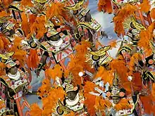 ![]() Ala 27 (plumas verde e amarelo) e ala 28 (plumas vermelha e laranja). Assim como a ala 26, a ala 28 também remete à canção "Caminhoneiro", mas, dessa vez, sob a perspectiva da saudade que os caminhoneiros sentem de suas esposas quando estão em viagem. |