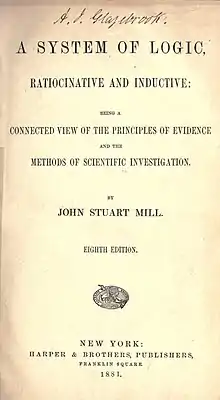 Neste trabalho, ele formulou os cinco princípios do raciocínio indutivo que são conhecidos como Métodos de Mill . Este trabalho é importante na filosofia da ciência e, de forma mais geral, na medida em que delineia os princípios empíricos que Mill usaria para justificar suas filosofias morais e políticas.