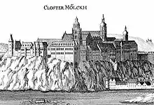Melk tem sido um centro importante desde as origens do estado austríaco. Já em 996 o primeiro marquês da região, Leopoldo II, ergueu um castelo em Melk para sua residência, e seus sucessores o encheram de relíquias e tesouros. O castelo foi dado aos monges beneditinos de Lambach em 1089, e desde lá tem sido ocupado por eles e adaptado como um mosteiro. A época da fundação do mosteiro foi marcada pela Questão das Investiduras, e floresceu na época posterior à Concordata de Worms, quando foi criada uma escola. Com o declínio do papado a sorte do mosteiro também declinou.