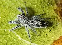 Abracadabrella elegans (Elegant Fly Mimic) de Townsville, Queensland. Uma aranha saltadora australiana. Fêmea, comprimento do corpo 4 mm. Imagem composta mostrando o lado da aranha e ela de frente.