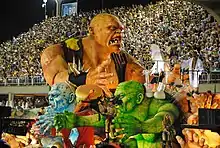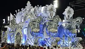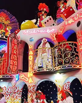 A atriz Juliana Paes assumiu o posto de rainha de bateria da escola.[39] Após quinze anos no Salgueiro, os carnavalescos Renato Lage e Márcia Lage foram contratados pela Grande Rio. Para o carnaval de 2018, os carnavalescos desenvolveram um enredo sobre o comunicador Chacrinha, morto em 1988.[40] O enredo narrou a história de Abelardo Barbosa de traz para frente: do sucesso na TV brasileira à infância no Recife. A Grande Rio foi a quinta escola a se apresentar na primeira noite do Grupo Especial. A agremiação fazia uma correta apresentação até que a última alegoria quebrou e não conseguiu entrar na pista de desfile. Além de problemas na evolução, a escola ainda ultrapassou o tempo limite de desfile em cinco minutos, perdendo cinco décimos na apuração. O desfile teve a participação de Gretchen (que foi jurada de calouros no Cassino do Chacrinha), Rita Cadillac (ex-chacrete) e Stepan Nercessian (que interpretou Chacrinha no cinema).[41][42] A Grande Rio se classificou na décima segunda colocação, o que previa o rebaixamento da escola junto com o último colocado, o Império Serrano. Em uma plenária, realizada após o carnaval, a LIESA decidiu cancelar o rebaixamento e manter as duas escolas na primeira divisão.[43] Apenas os presidentes de Mangueira e Portela votaram contra cancelar o descenso.[44] O Ministério Público do Rio de Janeiro abriu investigação sobre a "virada de mesa".[45] O inquérito foi arquivado após a LIESA assinar um Termo de Ajustamento de Conduta se comprometendo a não cancelar novamente o rebaixamento do concurso, caso contrário, estaria sujeita ao pagamento de multa.[46] O Estandarte de Ouro premiou o casal de mestre-sala e porta-bandeira Daniel Werneck e Verônica Lima. A escola também recebeu o Estandarte de inovação pelo uso de telão de led na comissão de frente.[47][48] Destaque também para Emerson Dias, que recebeu os prêmios Estrela do Carnaval, Gato de Prata e S@mba-Net de melhor intérprete.[49][50][51]