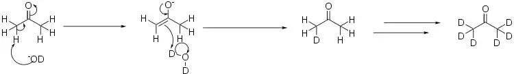 A fim de deuterar completamente a acetona, o processo é repetido várias vezes, destilando a acetona da água pesada e executando novamente a reação em um novo lote de água pesada.