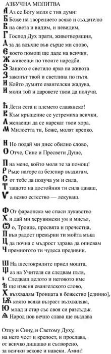 O búlgaro Constantino de Preslav escreveu um dos mais famosos abecedarius: a "Oração alfabética" (Азбучна молитва), um poema cristão escrito em versos dodecassílabos que se iniciam, cada um, com uma das letras do alfabeto glagolítico. A obra foi inspirada em uma similar, de autoria de Gregório de Nazianzo, que utilizava o alfabeto grego.[5]