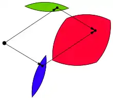 A figura vermelha é o resultado da soma de Minkowski das figuras verde e azul.