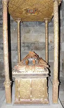 Composta por uma arca tumular e um jacente, encimada por um baldaquino (espécie de pálio), a obra é unanimemente considerada ímpar na tumulária europeia. A estrutura de madeira é totalmente revestida por elementos de cobre dourado e prateado, contendo ainda uma inscrição. O conjunto tumular não tem precedentes em Portugal, porquanto reúne características formais, estilísticas e materiais únicas na arte funerária medieval. Datado do século XV, tem 118 peças na parte tumular e 110 no baldaquino.[2]