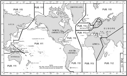 - Pub. 111 - As costas oeste da América do Norte e do Sul (Excluindo os Estados Unidos continental e Havai), Austrália, Tasmânia, Nova Zelândia, e as ilhas do Oceano Pacífico Norte e Sul.