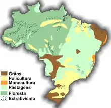 Inicialmente produtora de cana-de-açúcar, passando pelo café, a agricultura brasileira apresenta-se como uma das maiores exportadoras do mundo em diversas espécies de cereais, frutas, grãos, entre outros. Desde o Estado Novo, com Getúlio Vargas, cunhou-se a expressão que diz ser o "Brasil, celeiro do mundo"[nota 1] — acentuando a vocação agrícola do país.[5] Apesar disto, a agricultura brasileira apresenta problemas e desafios, que vão da reforma agrária às queimadas; do êxodo rural ao financiamento da produção; da rede escoadora à viabilização econômica da agricultura familiar: envolvendo questões políticas, sociais, ambientais, tecnológicas e econômicas. Ademais, uma de suas mais importantes características é a sua estrutura fundiária extremamente concentrada[6][7] com produção agrícola predominantemente voltada para o mercado externo.[7][8]