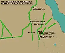 Nos séculos XIV e XV, muito do atual Sudão foi invadido por tribos árabes.[87] Talvez tenham lucrado com a praga que assolou a Núbia em meados do século XIV, matando muitos núbios sedentários, mas não afetando os árabes nômades.[88] Se misturaram à população sobrevivente, gradualmente tomando controle sobre a terra e pessoas,[89] beneficiando-se grandemente de sua grande população na disseminação de sua cultura.[90] A primeira migração árabe registrada à Núbia data de 1324.[91] Foi a desintegração de Macúria no fim do século XIV que, para o arqueólogo William Y. Adams, fez com que as "comportas explodissem". [92] Muitos, inicialmente vindos do Egito, seguiram o curso do Nilo até chegarem a Adaba. Aqui, se dirigiram para oeste para migrar junto ao Uádi Almalique até alcançar Darfur ou Cordofão.[93] Alódia, em particular Butana e Gezira, eram alvo dos que viveram entre os bejas[94] no Deserto Oriental por séculos.[95]