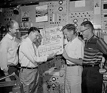 Após a guerra, Seaborg e Ghiorso retornaram a Berkeley, onde eles e os colegas usaram o ciclotron Crocker para produzir elementos de números atômicos cada vez maiores através do bombardeio de alvos atômicos com íons de hélio. Em experimentos durante 1949 e 1950, eles produziram e identificaram os elementos 97 (Berquélio) e 98 (Califórnio). Em 1953, em uma colaboração com o Argonne Lab, Ghiorso e os colaboradores conseguiram encontrar os elementos 99 (Einstênio) e 100 (Férmio), identificados pela radiação característica extraída do pó coletado pelos aviões que voavam próximos à primeira explosão termonuclear. Em 1955, o grupo usou o ciclotron para produzir 17 átomos do elemento 101 (Mendelévio), o primeiro novo elemento a ser descoberto átomo-a-átomo.