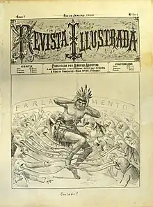 A partir da década de 1870, a figura do indígena ganhou contornos satíricos, humorísticos e sarcásticos, representando a nação brasileira indignada com as mazelas nacionais, como a escravidão, a corrupção e o atraso. Muitas revistas e periódicos da época se destacaram por esse uso, em especial a Revista Illustrada, de Angelo Agostini, grande crítico da monarquia, da Igreja Católica e do cativeiro.[3]