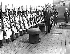 O Alfonso XIII finalizou sua rotina anual de treinamentos em 1927 e embarcou em setembro seu homônimo junto com a rainha Vitória Eugênia para um cruzeiro pelo litoral da Galicia. Os dois voltaram ao navio logo no mês seguinte para visitarem Ceuta e Melilha no Norte da África, onde as revoltas contra o domínio espanhol tinham sido recentemente subjugadas. O couraçado foi escoltado nesta viagem pelo Reina Victoria Eugenia, o cruzador rápido Mendez Nunez e o contratorpedeiro Bustamante. O Alfonso XIII participou em maio de 1929 de uma revista naval junto com navios britânicos, franceses, italianos e portugueses em celebração da Exposição Internacional de Barcelona. Nesta altura os efeitos da Grande Depressão tinham criado uma significativa oposição ao governo de Primo de Rivera, levando à sua renúncia em 28 de janeiro de 1930, enquanto abril do ano seguinte Afonso XIII fugiu para o exílio. A Segunda República Espanhola foi proclamada em 14 de abril, com o novo governo renomeado o Alfonso XIII três dias depois para España.[2][10]