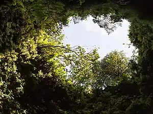 A erupção que lhe deu origem numa primeira fase, ao forçar e tentar romper o derrame traquítico, já existente e que constituía uma barreira natural de consistência pouco "colaborante", formou a zona da lagoa e as duas abóbadas sobre a mesma.