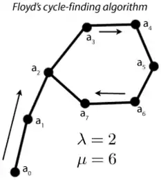 A diferença entre os dois índices que armazenam elementos iguais é kμ, um múltiplo do comprimento do ciclo. Algoritmo de busca-cíclica de Floyd encontra tal igualdade pelo processamento de duas instâncias de sequências em paralelo, uma das quais é mais "rápida" do que a outra; isto é uma instância processa duas iterações enquanto a outra processa uma. Então, quando: