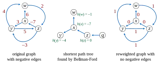 - O próxima borda do grafo original é reponderada usando os valores calculados pelo algoritmo Bellman–Ford: uma borda de u para v, tendo comprimento w(u,v), é dada pelo novo comprimento w(u,v) + h(u) −h(v).