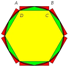No diagrama, a área amarela representa a área de um N-polígono, denotada por , e a área amarela mais a área verde representa a área de um 2N-polígono, denotada por . Portanto, a área verde representa a diferença entre as áreas do 2 N-polígono e do N-polígono:
