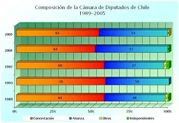O sistema binominal cria uma desproporção que permite, por exemplo, que em 1989 a coalizão Democracia e Progresso eleja, com 35% dos votos, 16 senadores (42% do total de eleitos democraticamente). Esta desproporção é acentuada notavelmente pelo fato de que os senadores designados são partidários do conglomerado de direita, resultando em um total de 25 senadores, que deixam em minoria os 22 eleitos pela Concertação.
