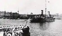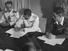 - "After some delay, and a failure to attend an earlier meeting, the Japanese local commander, Rear Admiral Jisaku Uzumi, came aboard HMS Nelson on the evening of 2 September, wearing the DSC he had earned as Britain's ally in the 1914–18 war, and surrendered the garrison. He fainted and was rushed to hospital; the military policemen who carried him there took his sword as a souvenir." Bayly & Harper, page 49