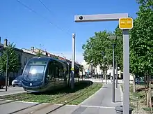 O APS é um sistema de alimentação eléctrica por uma terceira guia cuja cara superior está enraizada com a calçada e que está centrado entre os outros dois. A guia está formada por segmentos condutores de uma longitude de 8 metros, separados por trechos isolados de 3 metros. Um segmento da guia está baixa tensão, com corrente contínua de fase (750 V) somente quando o eléctrico o cobre completamente: a alimentação de corrente está controlada por caixas enterradas a cada 22 metros. Conforme avança, o eléctrico activa automaticamente a alimentação eléctrica da terceira guia, enviando um sinal às caixas de controle por médio de uma antena indutiva. O carro toma a corrente por médio de dois patines situados baixo os módulos intermediários da composição e separados mais de três metros, de maneira que sempre há ao menos um patin em contacto com a guia condutora. Nas mudanças de via a alimentação interrompe-se para evitar os curto-circuitos entre os patines (com potencial de fase) e as guias (com potencial neutro). Um disjuntor de posta a terra (interruptor diferencial) assegura a segurança das pessoas se, por falha, um segmento de guia segue alimentado sem estar coberto por um eléctrico. A caixa de alimentação de um segmento pode desactivar-se em caso de anomaiía. Por outra parte, os disjuntores dispostos na cada saída de subestação pode cortar a alimentação de secções em caso de falha. Se algum ou vários trechos se encontram fora de serviço, os eléctricos podem percorrer 150 metros a 3 km/h graças à energia acumulada numas baterias auxiliares.