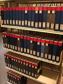 Estante com os volumes da Allgemeine Deutsche Biographie, hoje em domínio público.