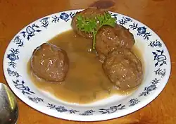 Almôndega, ou porpeta, é um prato cujo ingrediente principal é uma bola de carne magra moída (eventualmente substituída por proteína de soja) de aproximadamente 5 cm de diâmetro e servida, numa refeição, em várias unidades. Ela pode ser cozida, frita ou assada e sua receita ainda leva temperos e especiarias, além de um agente ligante, necessário para que o formato se mantenha até o momento do preparo do alimento.[1]
