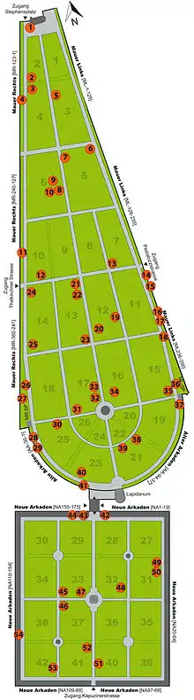 Localização de sepulturas conhecidas (pontos em vermelho no mapa); as cifras em verde mostram os campos de sepulturas (em alemão: Gräberfelder ou Sektionen). Os nomes associados podem ser consultados na placa na entrada do cemitério (ver também a imagem da placa abaixo) ou no arquivo em formato pdf: