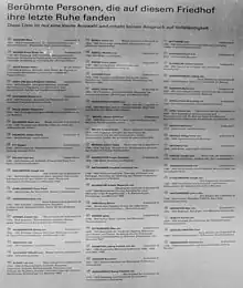 Tafel mit Namen berühmter Personen mit Nummernangabe zur Lage der Gräber (siehe Lageplan über diesem Bild)